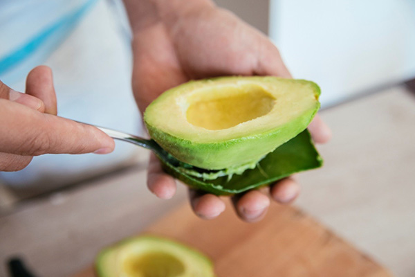 - Bơ rửa sạch vỏ để loại bỏ bụi bẩn, bạn lưu ý đừng để nước thấm vào phần thịt bơ nhé! Tiếp đến, bạn cắt đôi quả bơ, lấy hột và múc phần thịt bơ để làm kem.